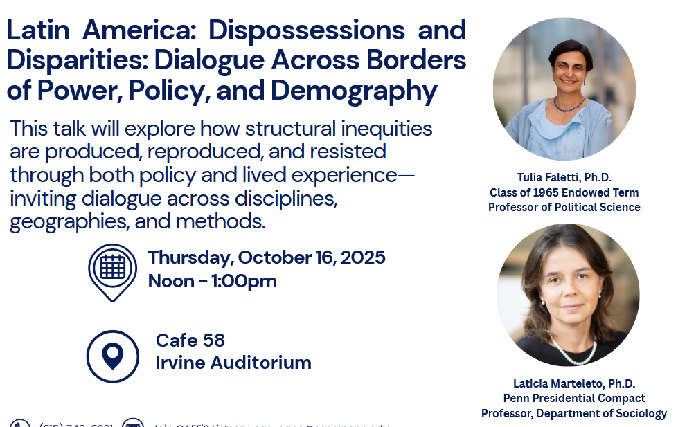 geographies, and methods. Speakers will be Tulia Faletti, Class of 1965 Endowed Term Professor of Political Scienc and Laticia Martleto, Penn Presidental Compact Professor of Sociology.